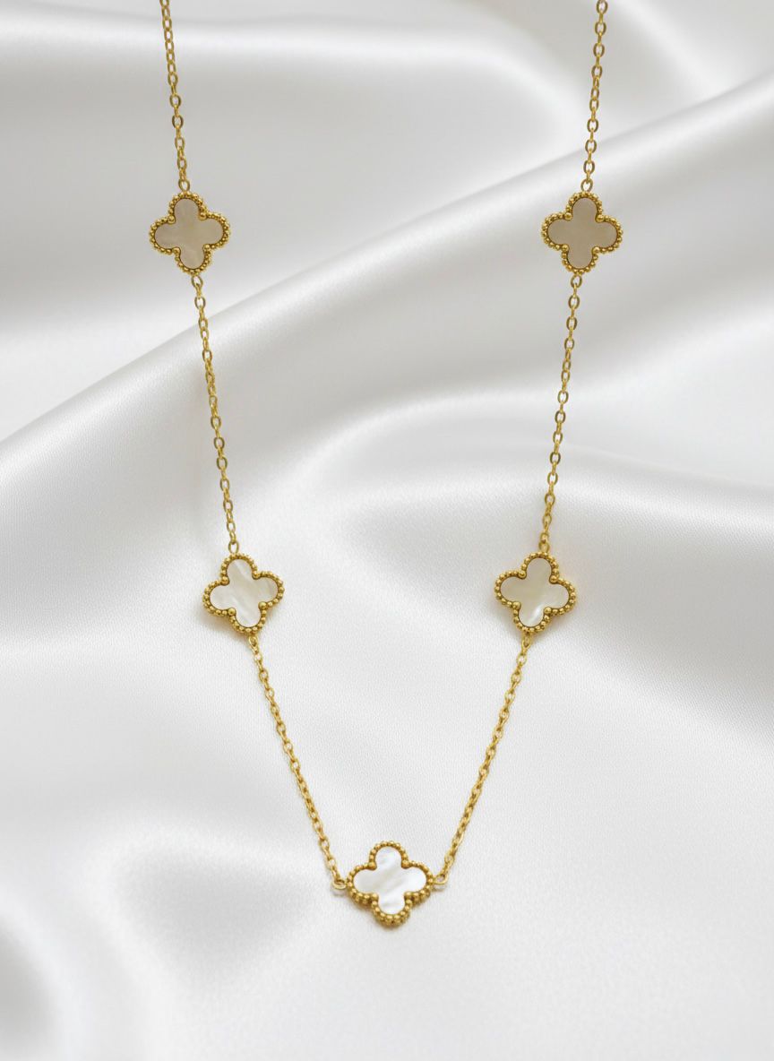 Elevate your everyday elegance with this timeless necklace featuring five delicate clover-shaped motifs. Crafted with a radiant gold-tone finish and shimmering mother-of-pearl inlays, each charm is framed by a signature beaded border for a vintage-inspired touch. Its minimalist yet sophisticated design makes it the perfect versatile piece for layering or wearing solo.